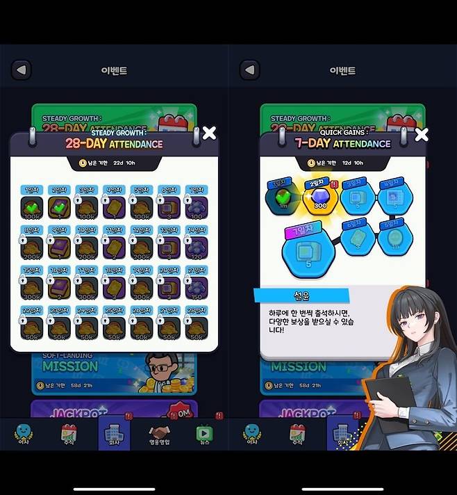 현재는 정식 출시를 기념해서 출석 이벤트, 소프트 랜딩 미션 등이 진행 중이고, 보상도 제법 풍성한 편이다. 특히 일부 이벤트에서는 5성 인재까지 지급하고 있기 때문에 초반 스타트업처럼 회사를 빠르게 성장시킬 수 있는 기회로 보인다.