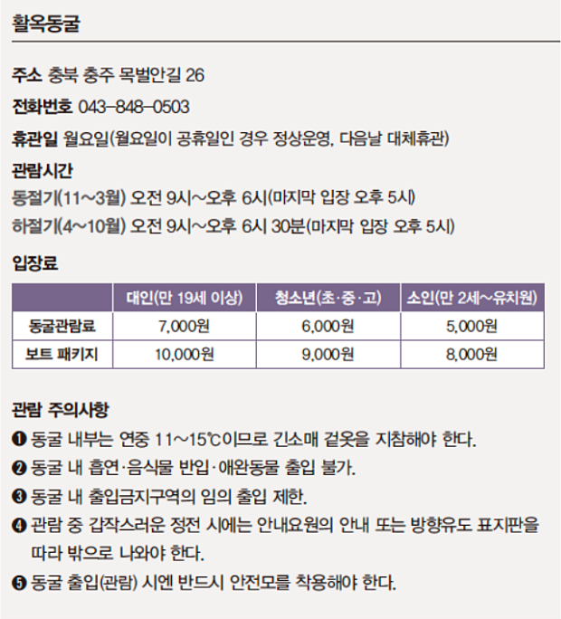 우리를 가장 놀라게 한 장소는 바로 동굴 속의 광활한 농원이다. 물고추냉이 농원에 도착하면 최첨단 재배방식인 발광다이오드(LED) 수경재배로 식물이 자라나는 신비로운 모습을 볼 수 있다. 동굴 속의 초원을 만나고 18가지 테마의 다양한 체험장을 지나면 동굴 끝에는 넓은 호수와 함께 보트장이 나온다. 투명카약을 타고 땅속 호수길을 따라 흥미로운 동굴탐험을 즐길 수 있다. 역사와 자연이 함께 어우러진 활옥동굴은 잊을 수 없는 특별한 경험을 선물해줬다. 신비한 동굴체험과 힐링, 그리고 무더위까지 잡을 수 있는 일석삼조의 여름 여행지다.