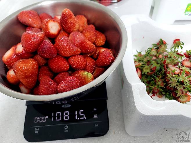꼭지를 제거하고 영 상태가 안좋은 딸기를 골라냈는데도 한 상자에서 나온 딸기가 1kg이 넘네요.