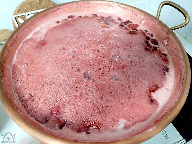 끓을 때는 워낙 물처럼 부글부글 끓어서 구분이 안되는데, 105도를 넘어 더 높은 온도가 될수록 잼이 단단해집니다.