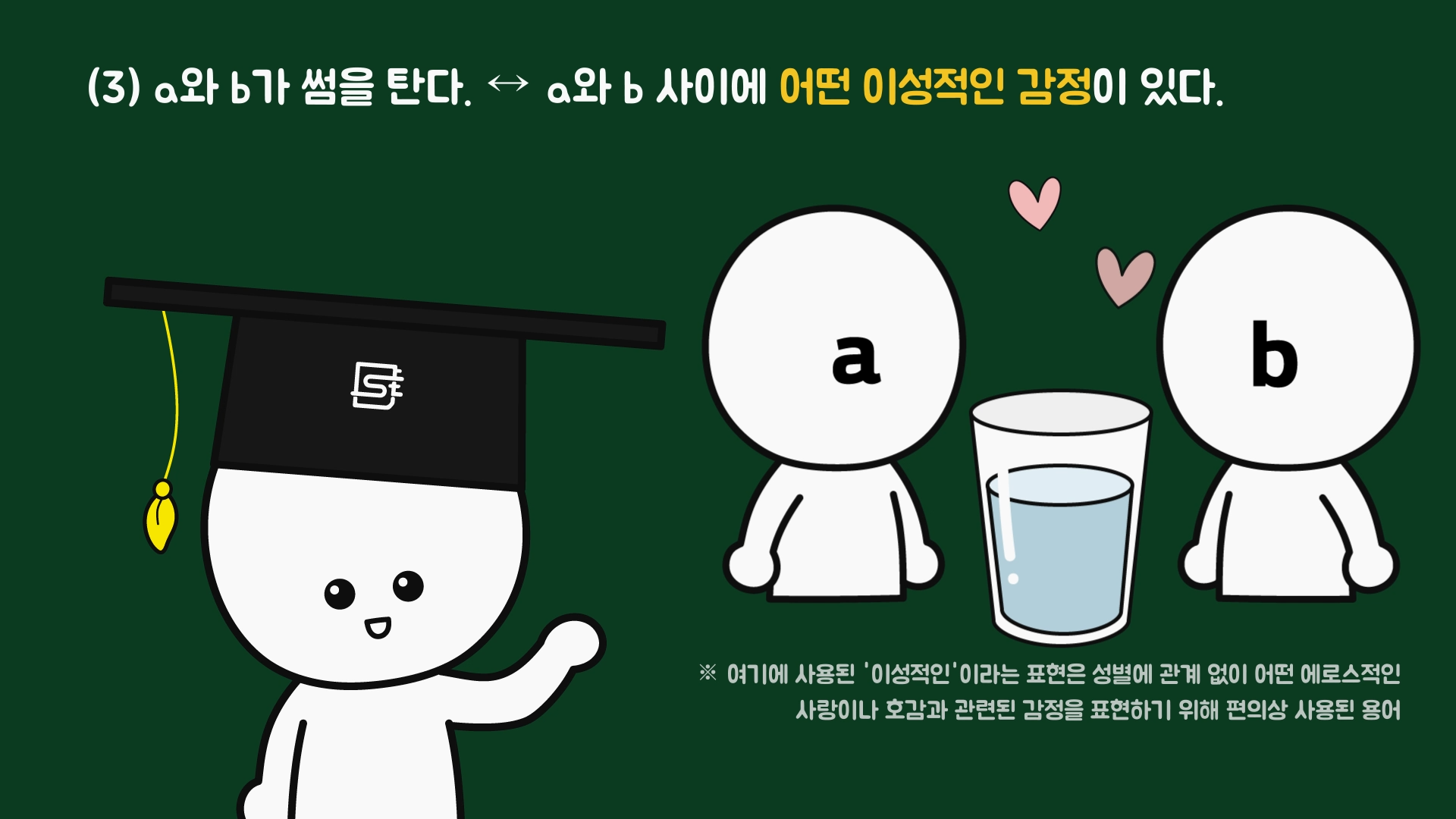 그 방식은 이렇습니다. 일단 혼자서는 썸탈 수 없으므로 2명이 있어야 하고, 그 둘 사이에 무엇인가가 있어야 한다는 명제를 설정합니다.