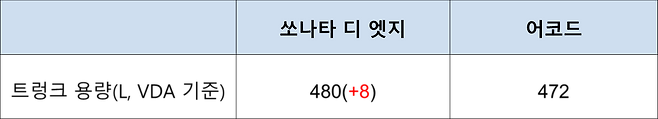 패밀리카로 접근하는 소비자에겐 트렁크 크기도 중요하다. 쏘나타의 기본 용량은 VDA 기준 480L다. 어코드는 472L로 쏘나타보다 약간 작다. 흥미로운 점은 어코드는 이전 모델보다 15L 넓다. 반면 쏘나타는 구형보다 30L 줄었다.