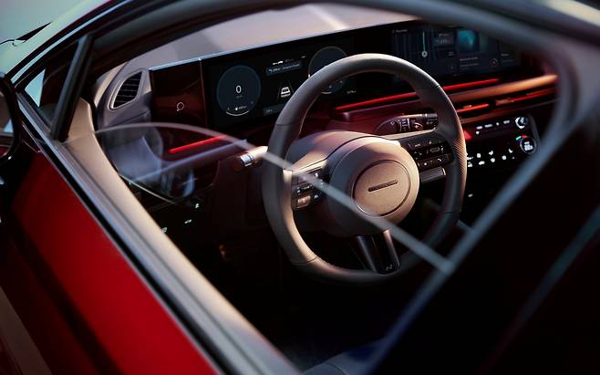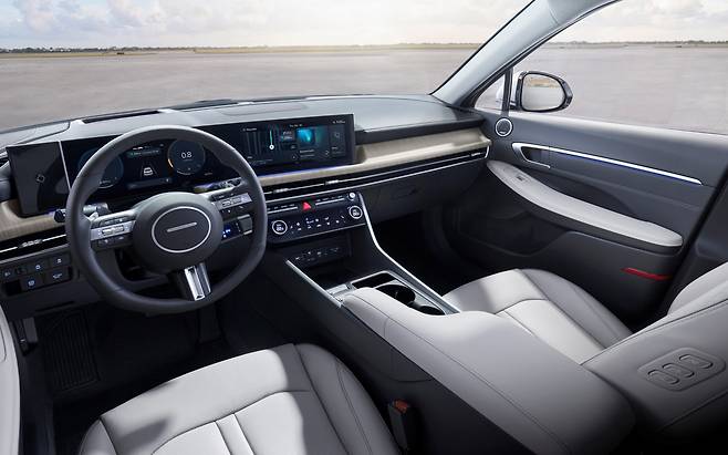 다음은 실내 비교. 쏘나타는 운전자 중심 구조를 유지하면서 미래지향적인 느낌을 더했다. 대시보드에는 현대차 최초로 파노라믹 커브드 디스플레이를 얹었다. 12.3인치 디지털 계기판과 중앙 인포테인먼트 화면을 하나로 이었다. 전자식 기어 버튼이 있던 센터콘솔에는 넓은 수납공간을 마련했다. 기어 레버는 운전대 뒤로 자리를 옮겼다.