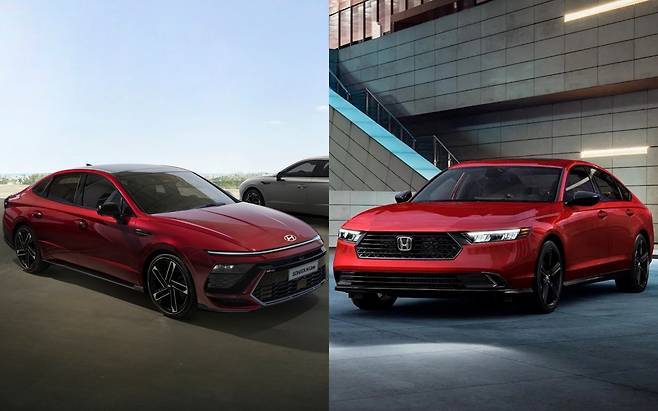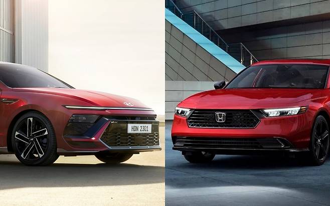 지난 4월, 혼다코리아가 신형 어코드 1.5L 가솔린 터보 모델의 배출가스 및 소음 인증을 마쳤다. 11세대 완전변경 모델로 이전보다 차분한 안팎 디자인과 성능을 개선한 엔진, 최신 안전 및 편의장비를 앞세워 국내 중형세단 시장에 뛰어들 예정이다. 비슷한 시기, 현대차는 파격적인 외모와 다양한 첨단 기능으로 무장한 쏘나타 디 엣지를 공개했다. 두 차의 차체 사이즈와 실내, 파워트레인, 연간 유지비 등을 항목별로 비교해 봤다.