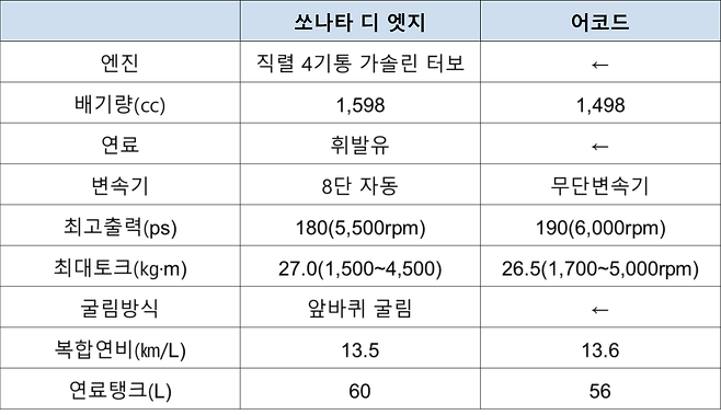 쏘나타의 직렬 4기통 1.6L 가솔린 터보 엔진은 최고출력 180마력, 최대토크 27.0㎏·m를 낸다. 어코드에는 최고출력 190마력, 최대토크 26.5㎏·m를 뿜는 직렬 4기통 1.5L 가솔린 터보 엔진이 들어간다. 쏘나타보다 배기량은 100㏄ 낮지만 최고출력은 어코드가 10마력 높다. 최대토크는 쏘나타가 0.5㎏·m 더 강력하다. 최대토크 뽑는 구간은 어코드 1,700~5,000rpm으로 쏘나타(1,500~4,500rpm)보다 넓다.