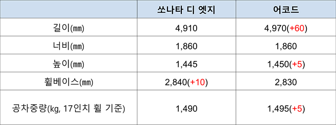 두 맞수는 4.9m 이상의 중형세단이다. 차체 길이는 어코드(4,970㎜)가 60㎜ 길고 높이 역시 5㎜ 높다. 너비는 1,860㎜로 같다. 휠베이스는 쏘나타가 2,840㎜로 어코드보다 10㎜ 길다. 몸무게는 쏘나타 1,490㎏, 어코드 1,495㎏로 5㎏의 차이가 있다.