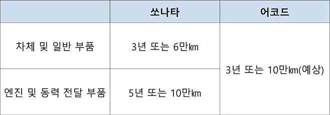 보증기간은 크게 ①차체 및 일반 부품 ②엔진 및 동력 전달 부품 두 가지로 나눈다. 어코드는 항목에 관계없이 모두 3년 또는 10만㎞를 보증할 전망이다. 쏘나타의 차체‧일반 부품 보증 기간은 3년‧6만㎞. 기간은 어코드와 같지만 주행거리 기준은 어코드가 더 넉넉하다. 엔진 및 동력 전달 부품은 쏘나타가 어코드보다 2년 더 보증한다(선도래 기준).