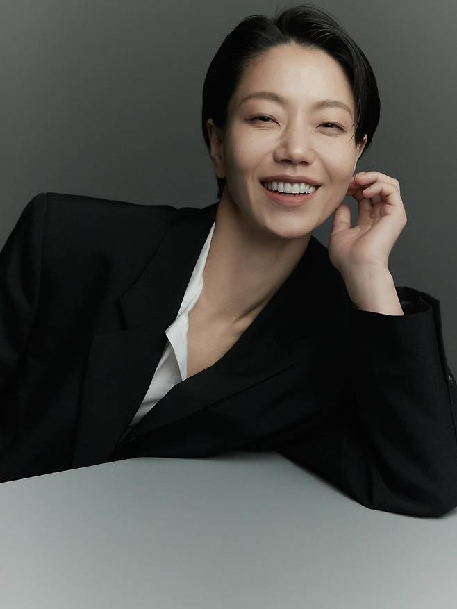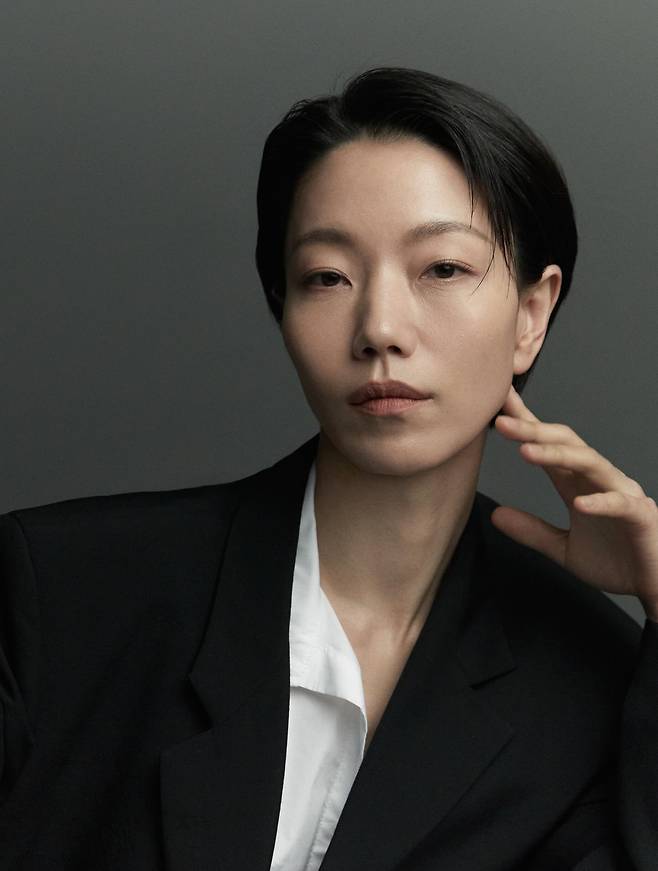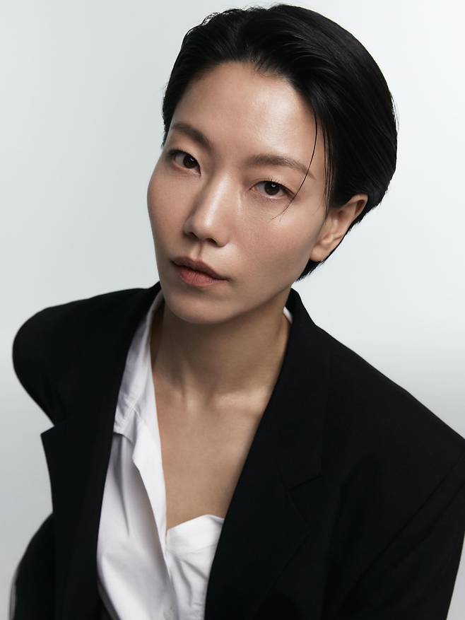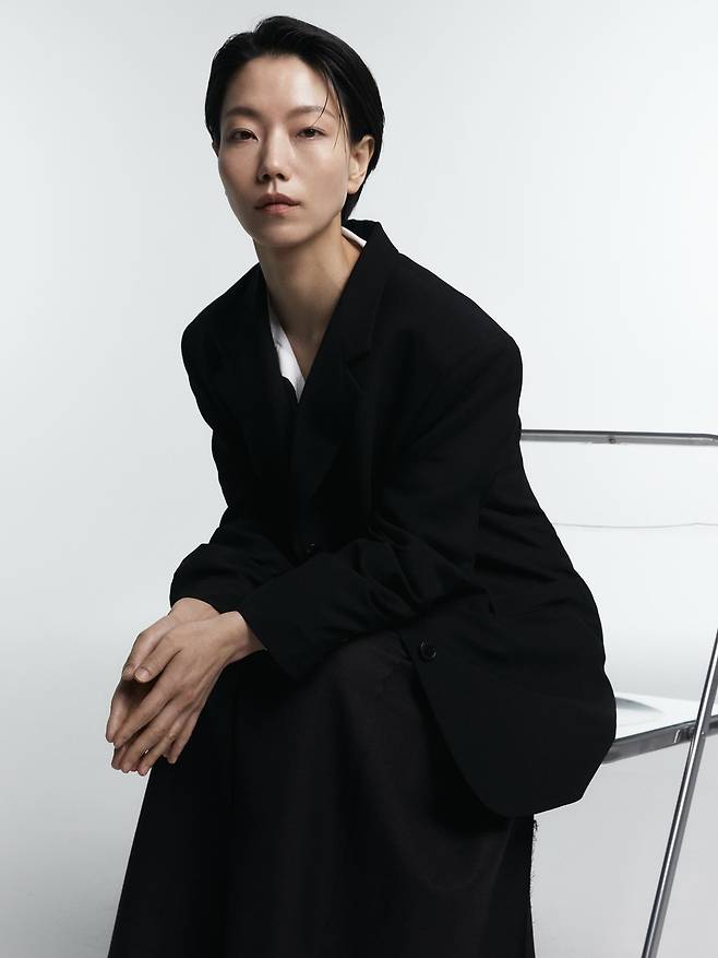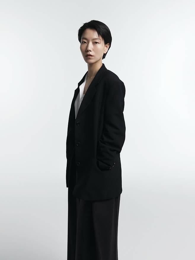 무채색 배경과 군더더기 없는 조명, 그리고 블랙 테일러드 재킷과 화이트 셔츠의 조합이 그녀의 이목구비와 표정에 집중하게 만들죠.