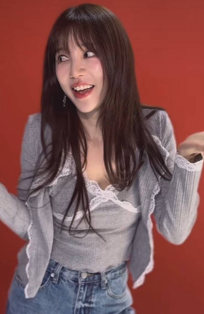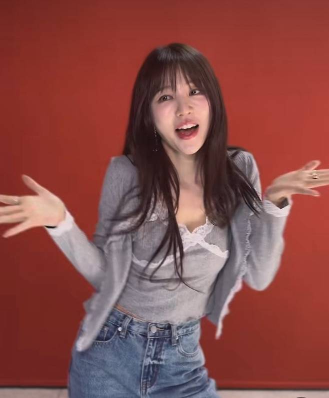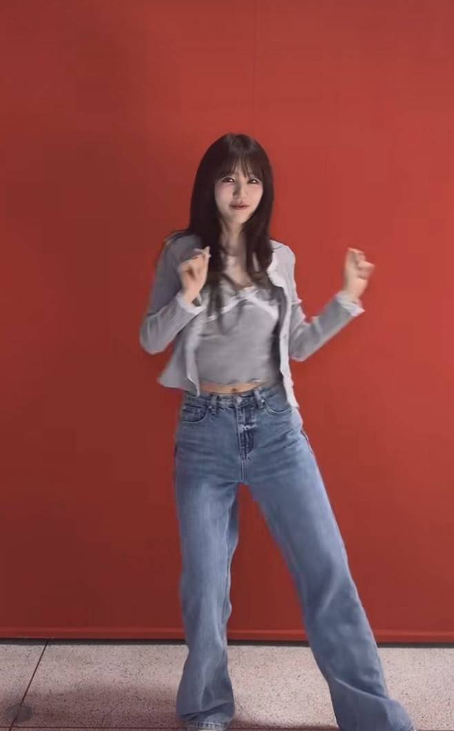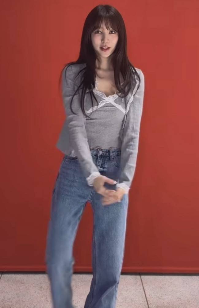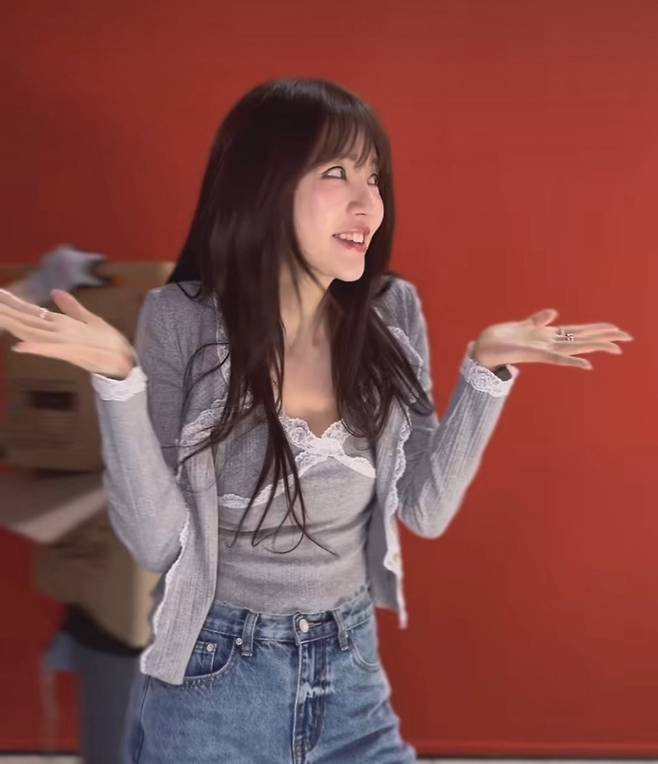 니트는 크롭 기장과 리본 장식으로 소녀스러운 포인트를 주었고, 밝은 그레이 톤이 청량한 이미지를 더했습니다.