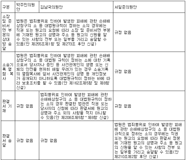 이에 따라 범죄피해자의 손해배상 청구권을 보장하기 위해 민사소송법에 피해자의 개인정보를 보호하는 근거를 마련해야 한다는 목소리가 커지고 있다. 실제로 범죄피해자의 개인정보를 보호하는 골자의 민사소송법 개정안이 발의됐지만 모두 국회에 계류 중이다. 현행 21대 국회에서 발의된 개정안은 총 4개로 범죄행위로 인해 발생한 피해에 대해 손해배상청구 시 소장과 판결문 등에 개인정보가 공개되지 않도록 보호하는 내용이 담겼다.