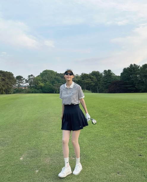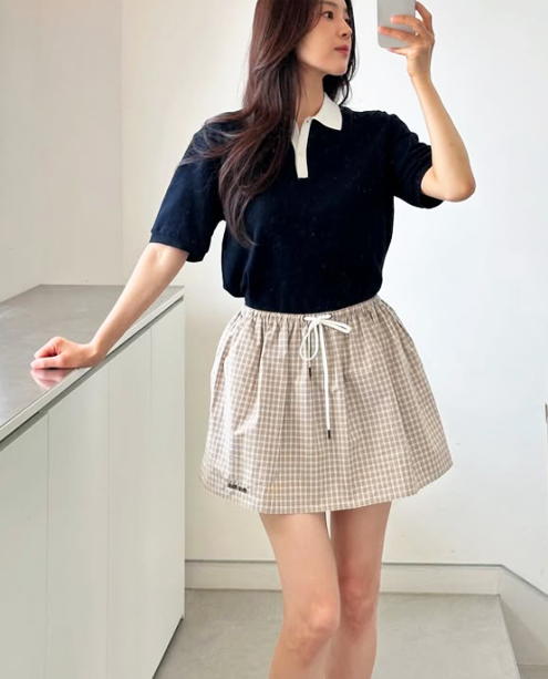 베이지 계열의 체크 패턴 스커트에 네이비 반팔 니트를 매치해 캐주얼하면서도 단정한 분위기를 연출했다.