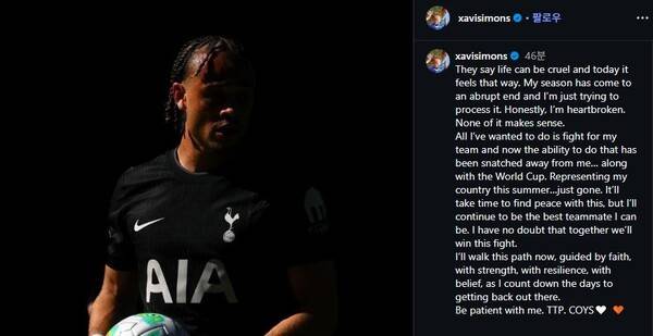 [공식 발표] "인생 참 잔인해…내 시즌 끝났다" 손흥민 후계자 시몬스, ACL 파열→2027년 복귀…토트넘 초비상