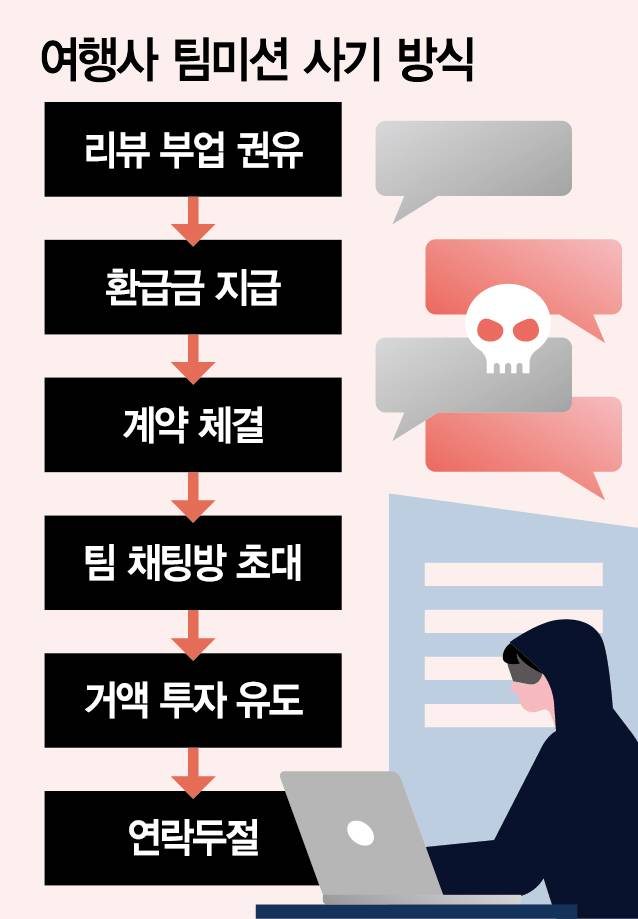 제품 리뷰 작성 후 환급금 지급을 미끼로 투자를 유도해 이를 가로채는 '팀 미션 사기'는 과거 e커머스 업종을 중심으로 창궐했지만 여행사를 사칭한 사례는 이번이 처음이다.