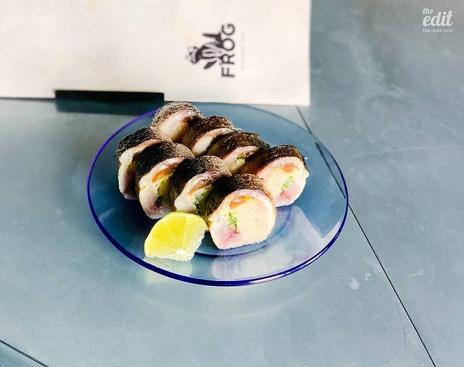 함께 곁들일 음식은 보우즈시. 생선으로 만든 봉초밥을 말하는데, 프로그 하이볼 바에서는 주로 고등어 봉초밥을 제공한다. 싱싱한 고등어에 밥과 초생강 등을 넣어 말고 윗면을 토치로 살짝 굽는다. 라임을 뿌려 좀 더 상큼하게 먹는 것도 좋다. 한 덩이를 입 안 가득 씹으며 음미한 뒤, 시원한 하이볼 한 모금 하면… 아, 내일 출근하기 싫다.