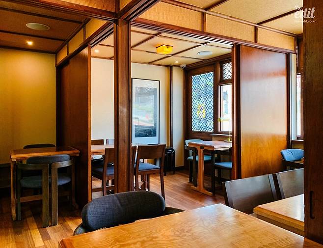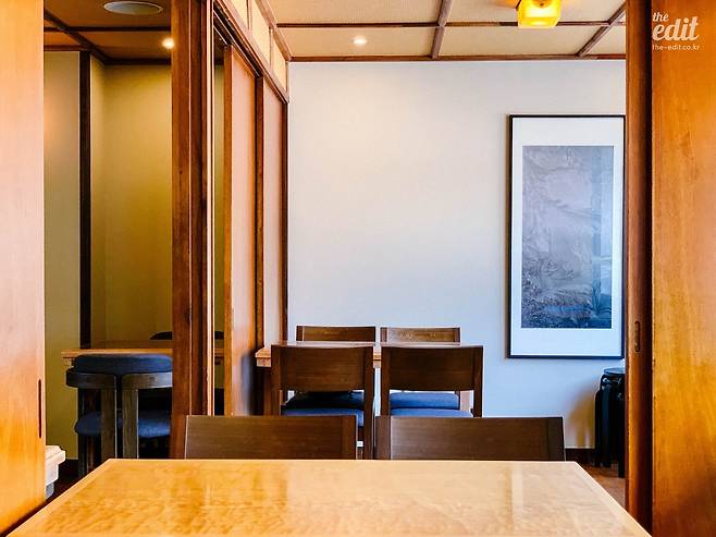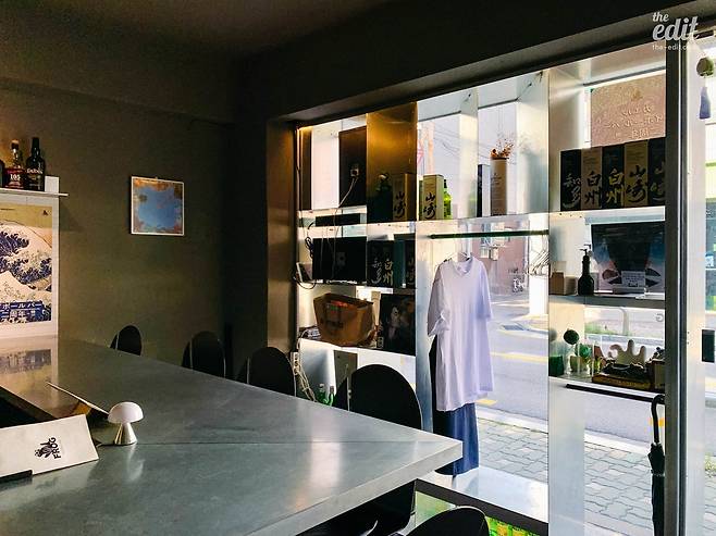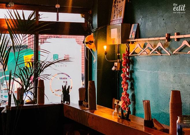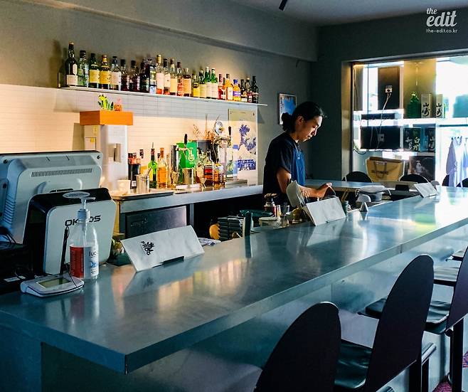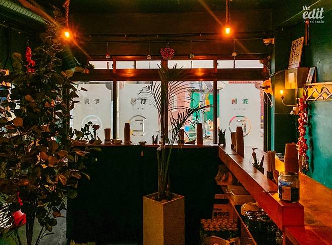 내부 공간도 영화 속 식당과 크게 다르지 않다. 짙은 녹색 벽면과 차분하게 내려앉는 노란 조명, 거기에 개별 테이블 없이 ㄷ자 모양의 나무 닷지 테이블로만 구성된 좌석이 공간을 채운다. 주인장은 가운데 공간을 오가며 술과 음식을 내어주는데, 혼술을 즐기러 오는 손님들 역시 적지 않게 보이고 이따금 처음 보는 손님들끼리 즐겁게 이야기를 나누는 광경도 펼쳐진다고 한다. 혼자 가볼까 생각하는 독자분들, 걱정 말고 가셔도 된다.