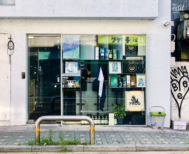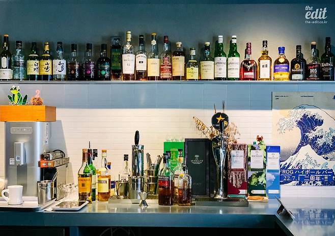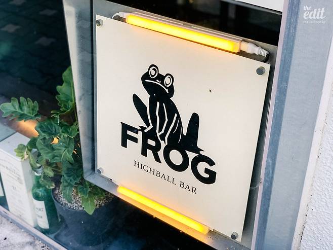 망원동에서 일하는 나는 퇴근할 때마다 이곳이 궁금했다. 강렬한 개구리 일러스트 로고와 유리창 너머로 보이는 프랭크 오션의 앨범 LP 때문에 괜히 더. 무엇보다 ‘하이볼 바’라는 타이틀이 흥미를 자극했다. 왠지 술을 잘 못 하는 나도 종종 갈 수 있을 것만 같고, 그동안 다녀본 하이볼 파는 술집들과는 다른 분위기처럼 느껴졌다. 간판도 따로 없고 작은 매장 내부도 그다지 따뜻해 보이지 않음에도 매번 사람들이 가득한 것도 신기했다.