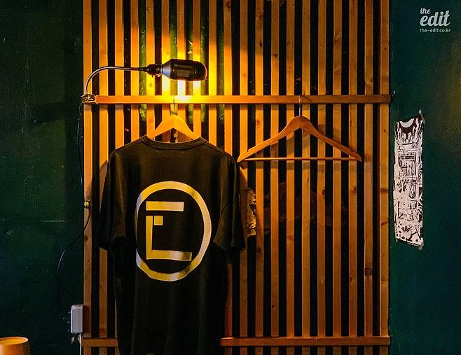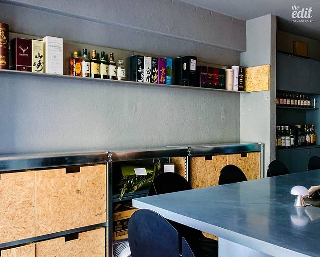 처음 ‘하이볼 바’라는 이름을 들었을 때 나는 크게 두 가지 이미지를 떠올렸다. 단란하고 친근하고 다소 투박한 매력까지 있는 심야식당 감성, 그리고 비싼 위스키들이 벽면을 가득 채운 깔끔하고 고급스러운 바의 분위기. 프로그 하이볼 바는 둘 다 해당되지 않는다. 나무 대신 스틸 소재와 무채색 계열 위주로 채워 좀 더 차갑고 러프한 무드를 줬다. 선반에 걸린 티셔츠와 소품들, 스피커에서 흘러나오는 힙합과 알앤비 음악이 힙한 편집숍을 연상시키기도. 아니나 다를까 주인장이 평소 좋아하는 패션 브랜드인 ‘와코 마리아’의 도쿄 매장(https://bit.ly/3zzxMD4)에서 영감을 얻어 공간을 꾸몄다고 한다.