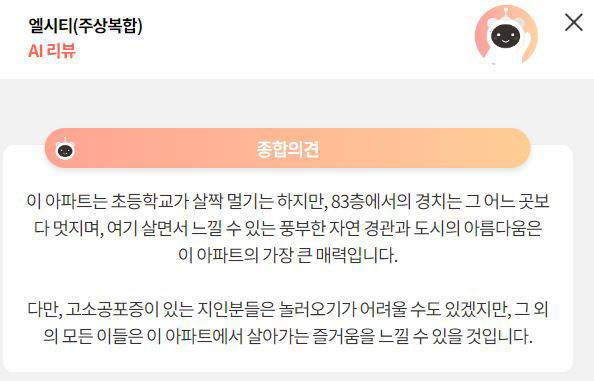 AI리뷰에는 실제 거주한 입주민들의 생생한 후기도 담겨있다. 초고층이라 고소공포증이 있으면 실거주하기 힘들 수 있고, 초등학교 등 학군이 멀다는 점 등이 대표적이다. 또한, 공용현관까지 거리가 길어 택배를 받기 어렵다는 점도 단점으로 꼽힌다. 그리고 초고층 건물 특성상 유지 관리비는 높을 수밖에 없다. 세대 관리비는 70만~100만원 수준으로 전해진다.