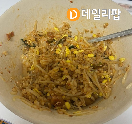 - 양념장을 잘 섞은 다음 삶은 콩나물과 밥, 양념장을 함께 넣어 잘 비벼서 먹으면 된다.