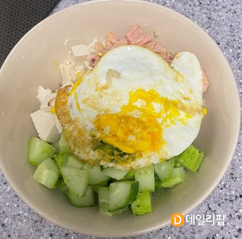 다이어트 레시피인 ‘오이 명란 두부 덮밥’을 자취생에게 맞게 변형한 ‘오이 참치 두부 덮밥’입니다.