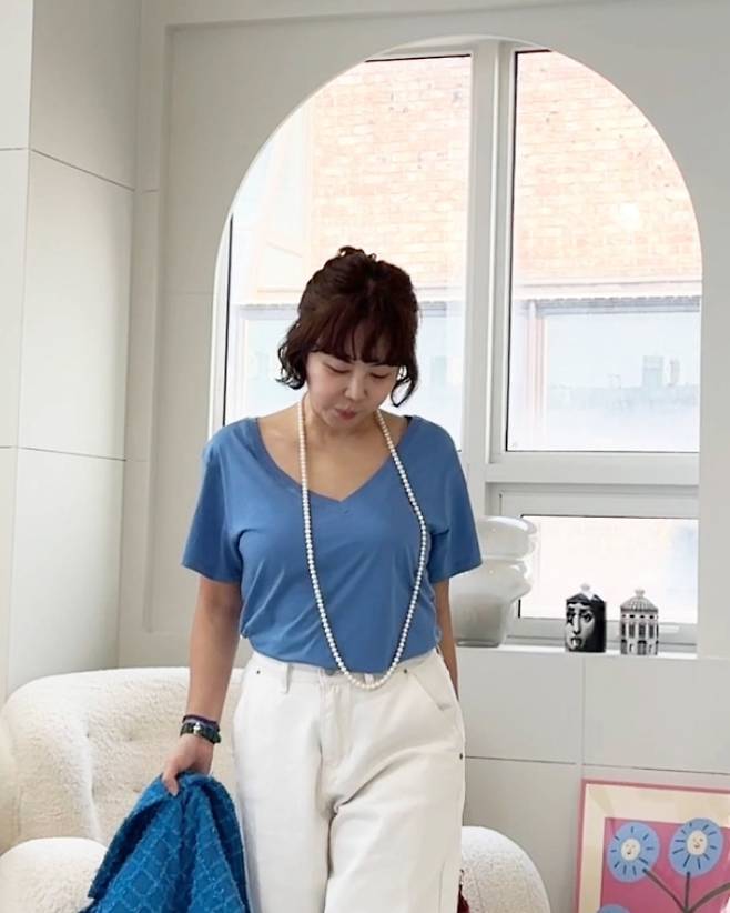 황혜영은 블루 브이넥 티셔츠와 화이트 와이드 팬츠를 매치한 편안한 홈웨어 룩을 선보이고 있다. 긴 진주 목걸이를 포인트 액세서리로 활용해 캐주얼한 실루엣에 우아함을 더하고 있으며, 아치형 창문이 있는 모던한 인테리어 공간에서 미니멀하면서도 세련된 분위기를 연출하고 있다.