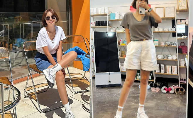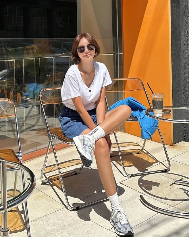 화이트 브이넥 티셔츠에 네이비 쇼츠를 조합한 깔끔한 여름 스타일을 완성했다. 화이트 스니커즈와 선글라스로 스포티한 매력을 강조하며, 카페 테라스에서 자연스럽고 편안한 일상 패션을 연출하고 있다.