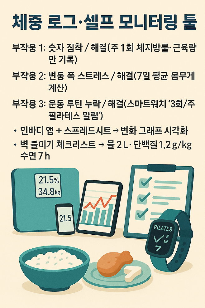 부작용 1 : 숫자 집착 / 해결(주 1회 체지방률·근육량만 기록)