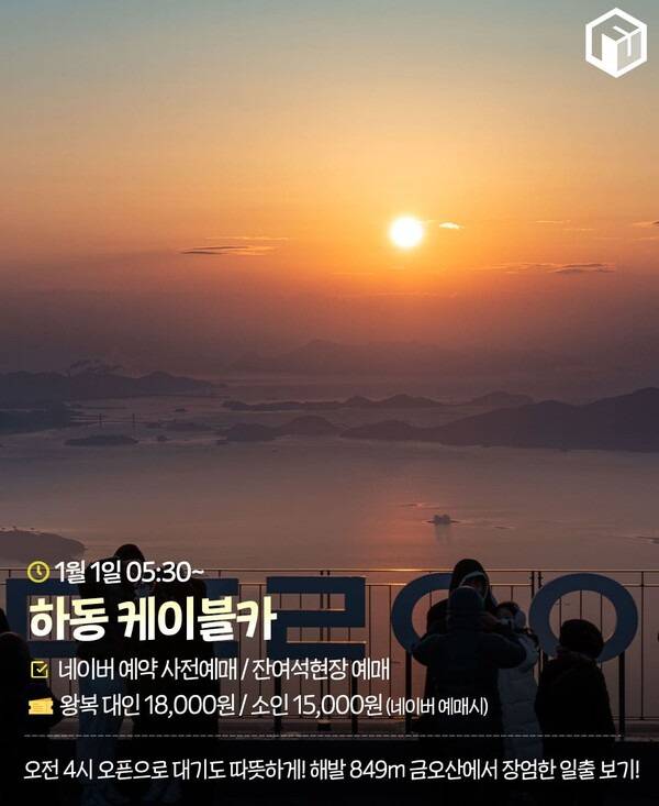 하동 케이블카는 해맞이를 위해 방문하는 탑승객들을 위해 오전 4시부터 매표소를 개방할 예정입니다. 매표 오픈 시간까지 추위에 떨며 대기하지 않아도 되는 것이죠. 하동 케이블카 2025 해맞이 탑승권은 네이버 예매를 통해 사전 온라인 예약이 가능하니, 사전 예매 후 방문할 것을 추천합니다.