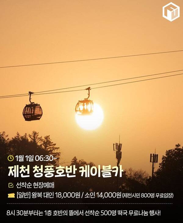 장엄한 청풍호반의 절경을 한 눈에 감상할 수 있는 제천 청풍호반 케이블카의 2025년 새해 해맞이 행사는 6시 30분부터 시작됩니다. 약 1시간동안 운영되는 케이블카를 탑승해 전망대에 올라서면, 청풍호반 사이로 떠오르는 새해 첫 해를 감상할 수 있는 것인데요.