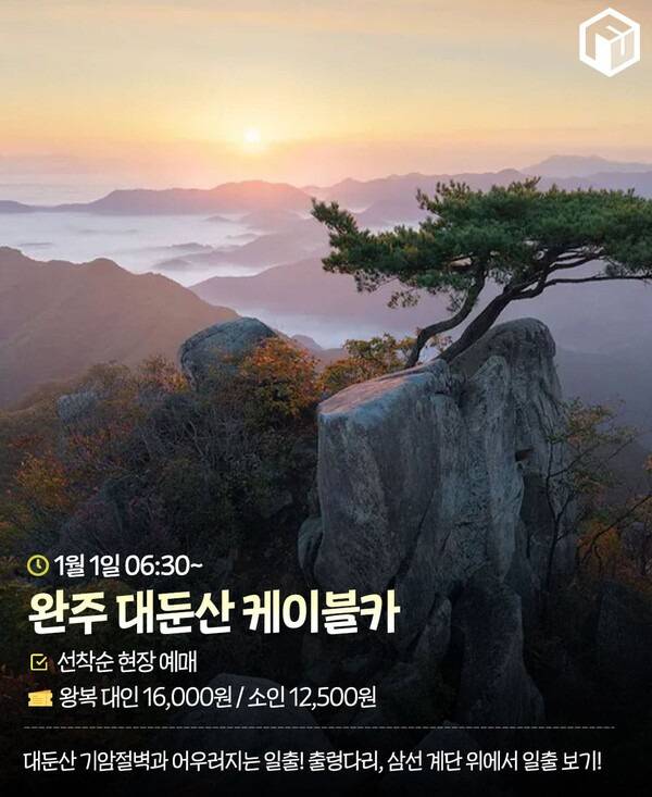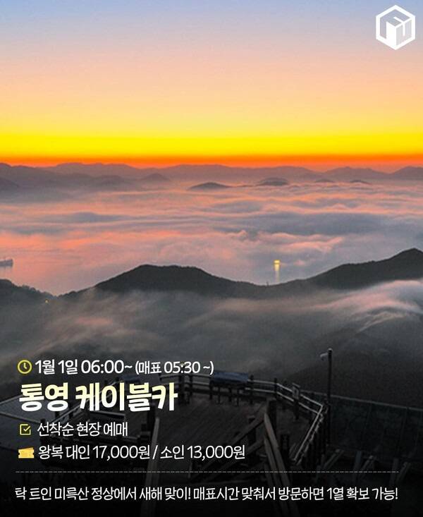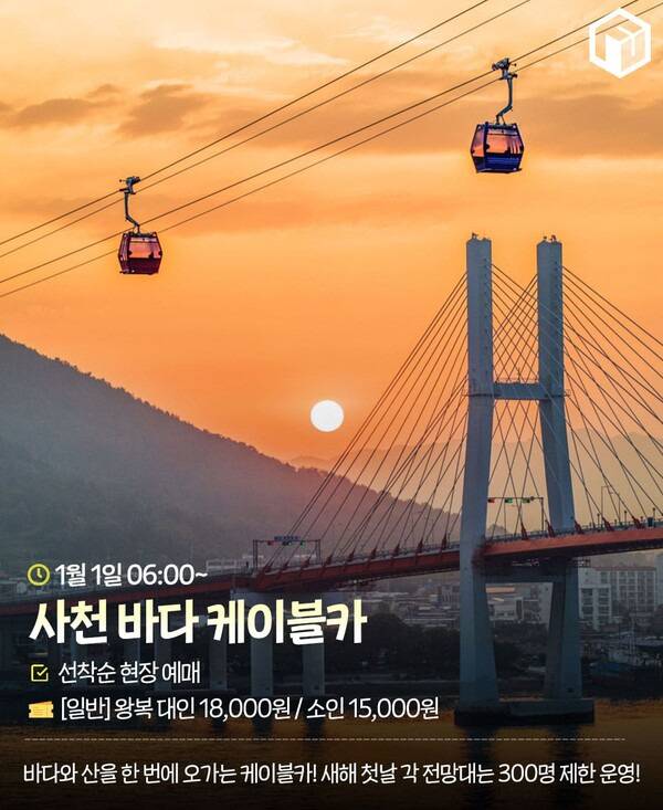 오늘 여행톡톡은 2025년 새해를 보다 특별하게 맞이할 수 있는 전국 케이블카 새해 해맞이 행사 11가지를 총정리해 소개합니다. 선착순 현장 예매가 많지만 사전 예매를 받고 있는 곳도 있으니, 특별하게 2025년 새해 일출을 보고싶은 분들은 참고해보세요!