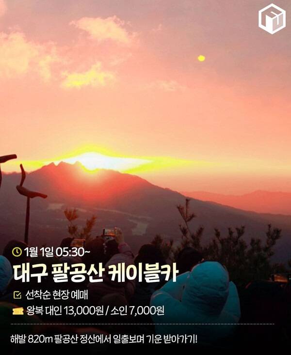 팔공산 케이블카는 2025년 새해 첫 날, 정상에서 일출을 감상할 수 있도록 오전 5시 30분부터 조기 운영을 시작합니다. 장엄한 일출을 감상한 뒤, 갓바위와 소원바위, 동화사를 돌며 새해 소원을 빌어보며 새해를 맞이해보시길 바랍니다.