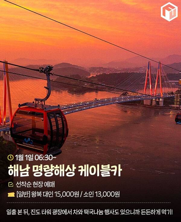 이순신 장군의 명량대첩 승전지로 알려진 울둘목 해협 위를 가로지르는 해상 케이블카, 해남 명량해상 케이블카입니다. 한반도의 '땅끝마을'이 위치한 해남은 2025년 새해를 맞이해 해넘이, 해맞이 행사가 곳곳에서 펼쳐질 예정이기도 한데요. 해남 명량해상 케이블카는 2025년 1월 1일 오전 6시 30분부터 조기운영을 시작합니다.