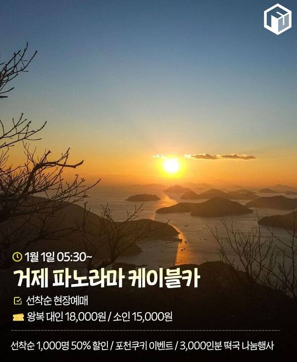 거제 파노라마 케이블카의 해맞이 행사에서는 포천쿠키 이벤트, 3,000인분 떡국 나눔행사 등 일출과 함께 즐길 수 있는 부대 행사가 마련될 예정입니다. 일반 캐빈과 바닥이 투명한 크리스탈 캐빈 중 선택할 수 있으며, 온라인 예매건은 새해 첫 날 사용이 불가능합니다.