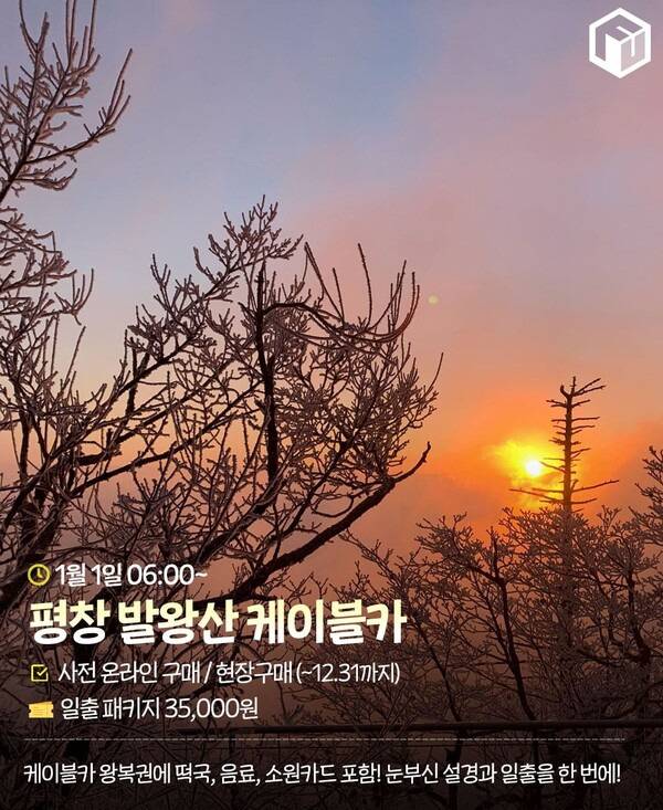 평창 모나용평 리조트에서 발왕산 정상까지 왕복 7.4km의 하늘길을 잇는 발왕산 관광 케이블카입니다. 모나용평 리조트는 2025년 새해 일출을 발왕산 정상에서 감상할 수 있는 '일출 패키지'를 판매하고 있는데요. 케이블카 왕복 이용권과 떡국, 음료와 소원카드가 제공됩니다.