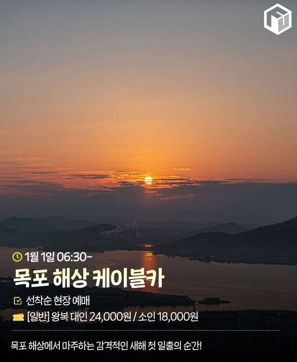 목포의 원도심과 북한, 유달산과 고하도 등 다도해의 수려한 경관을 한 눈에 담을 수 있는 목포 해상케이블카입니다. 목포 해상케이블카는 2025년 새해 첫 날 오전 6시 30분부터 조기 운영을 시작합니다. 매표시간 기준, 6시 20분부터 9시 사이에는 3천원 할인 쿠폰이 제공됩니다.
