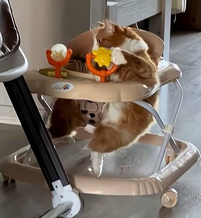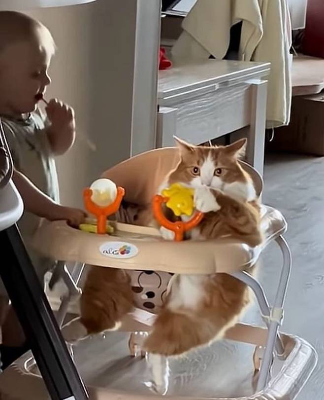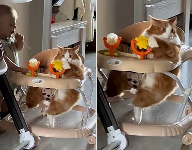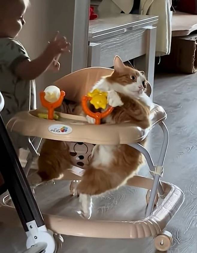혹시 자기가 타고 싶은 것은 꼭 타야 직성이 풀리는 고양이를 본 적이 있나요? 여기 아기가 걷기 연습을 위해 사용하는 보행기를 자기 전용처럼 차지해 버린 배짱 두둑한 고양이가 있습니다.
