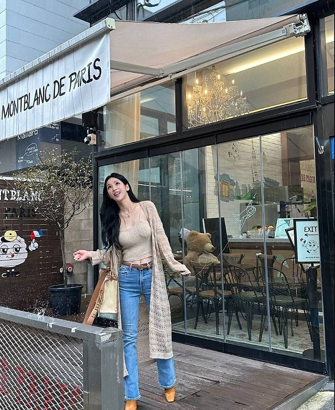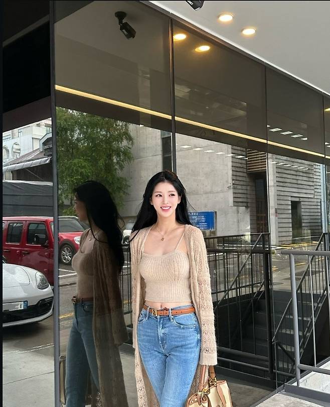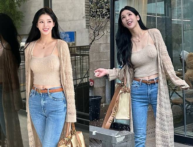 또, 강다은은 청바지에 갈색 벨트를 둘러 청순하고 스타일리시한 분위기를 자랑했습니다.