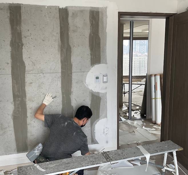 지어진지 오래되지 않은 아파트라 전체적인 컨디션은 좋았지만 전반적으로 어두운 톤의 분위기 때문에 벽지만 밝은 흰색으로 시공하기로 결정했습니다.