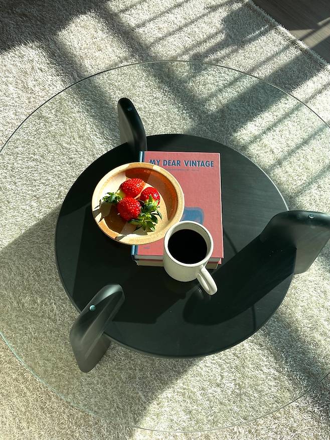 생각보다 각진 가구들 투성이었던 저희 집에 묵묵히 동글동글함을 맡아주고 있는 친구입니다. 읽고 싶은 책 한 권 넣어두고 커피 마실 때마다 한 번씩 꺼내 보기에 정말 좋습니다.