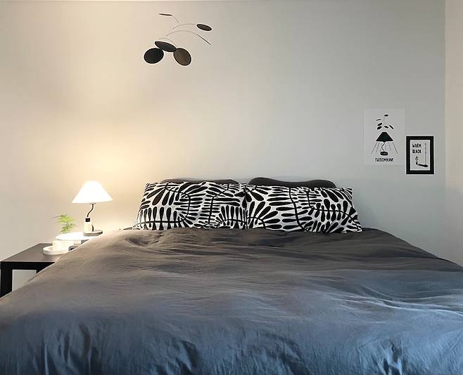 특별히 신경 쓴 부분이라면 곳곳에 블랙 컬러의 침구와 가구를 배치하되 재질이나 어두운 정도를 조금씩 다르게 하여 공간이 너무 단조롭지 않도록 했습니다.