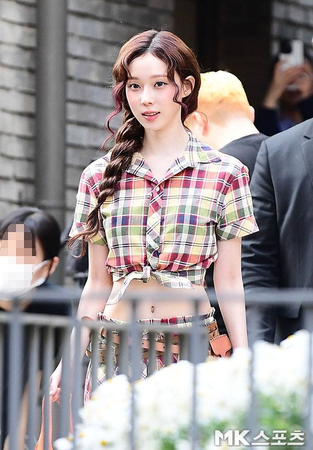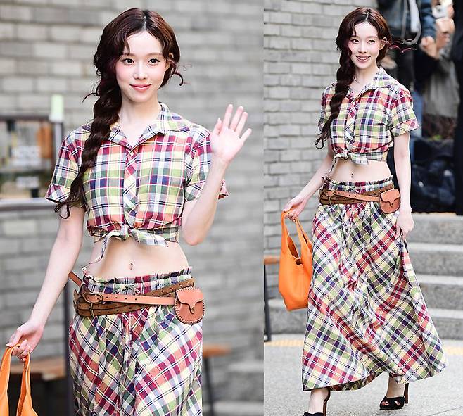 컬러풀한 체크 셋업은 크롭 셔츠로 상큼함을 더했고, 하이웨이스트 스커트는 롱한 실루엣을 강조했습니다.