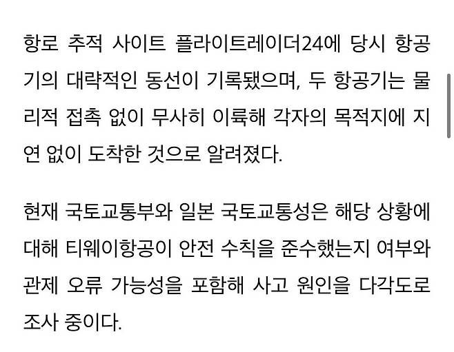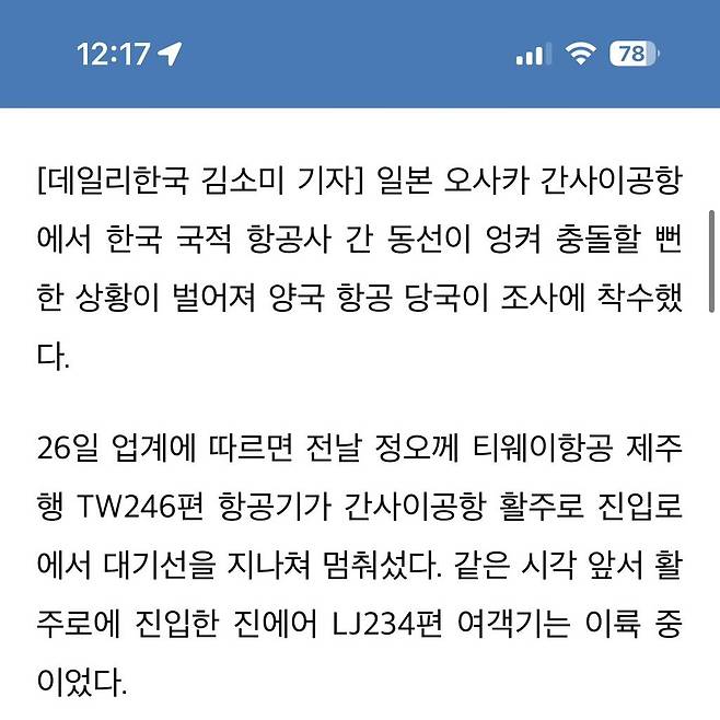 [데일리한국 김소미 기자] 일본 오사카 간사이공항에서 한국 국적 항공사 간 동선이 엉켜 충돌할 뻔한 상황이 벌어져 양국 항공 당국이 조사에 착수했다.26일 업 계에 따르면 전날 정오께 티웨이