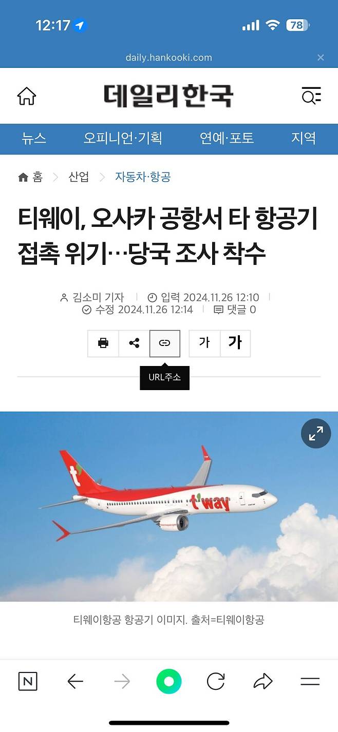 티웨이, 오사카 공항서 타 항공기 접촉 위기…당국 조사 착수 - 데일리한국