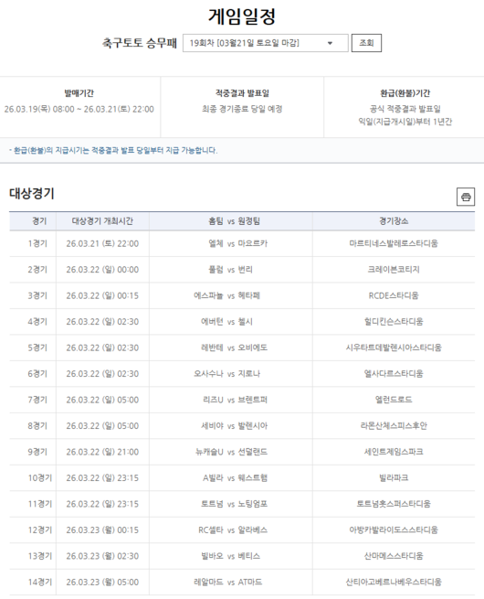 이번 축구토토 승무패 19회차는 3월 21일(토)부터 23일(월)까지 펼쳐지는 잉글랜드 프리미어리그(EPL)와 스페인 라리가 등 유럽 주요 리그 14경기를 대상으로 진행된다.