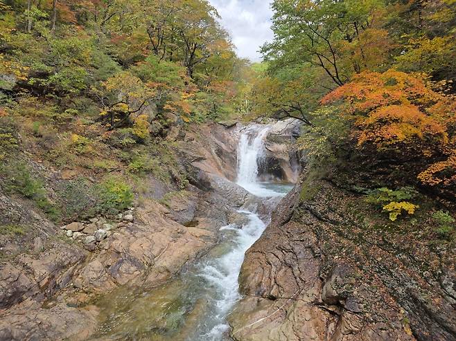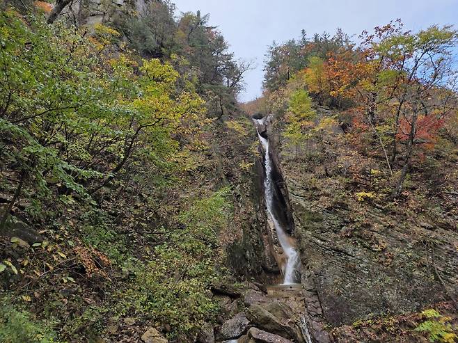 등선대에서 내려오면 오색 방향 하산로가 이어집니다. 설악산 특유의 바위 지형 특성상 낙석 위험이 있어 안전시설이 보강되어 있지만, 여전히 주의가 필요합니다. 용소폭포는 가파른 계단과 출렁다리를 지나 만날 수 있습니다. 약 10m 높이의 폭포 아래 깊이 7m의 소가 자리하고 있으며, 예로부터 두 이무기의 전설이 전해지는 신비로운 장소입니다. 주전골 탐방지원센터에서 약 1시간 20분 거리에 위치해 남녀노소 누구나 쉽게 들를 수 있는 명소입니다.