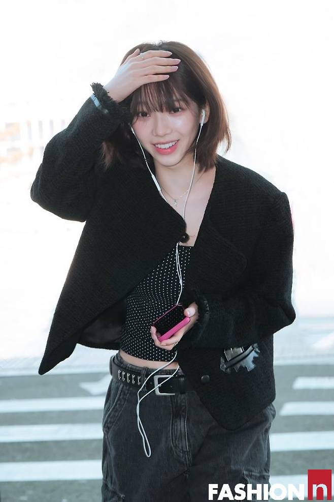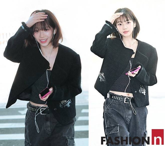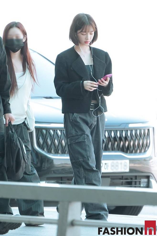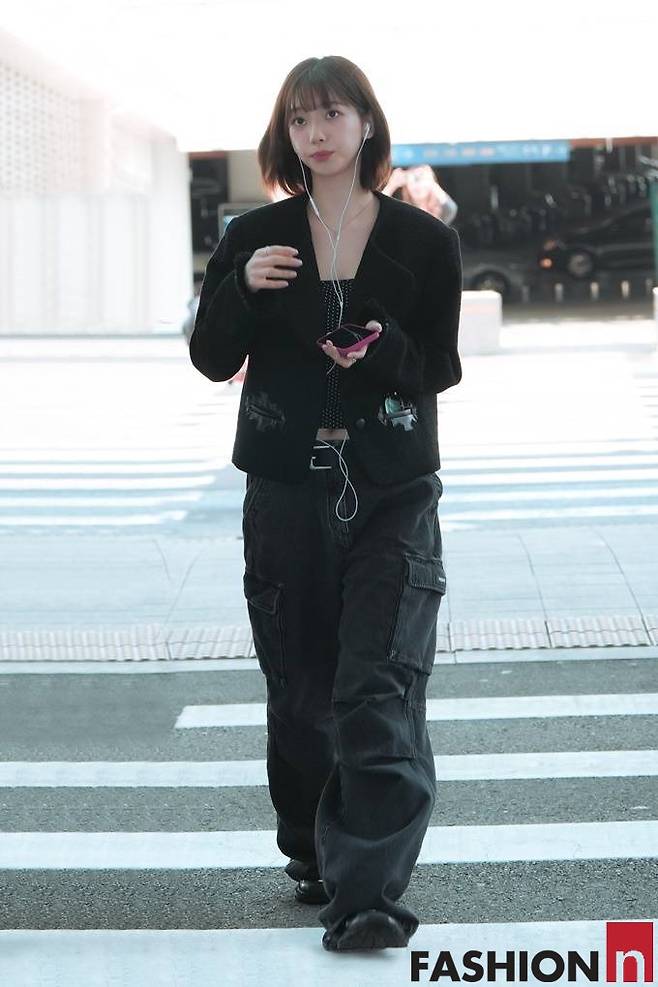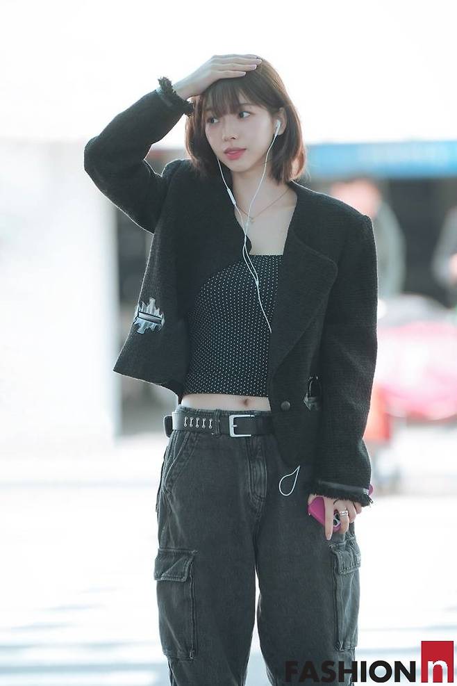 아날 카리나는 블랙 크롭 트위드 재킷과 카키 카고 팬츠를 매치해 무심한 듯 시크한 공항룩을 연출해 주목을 받았다.