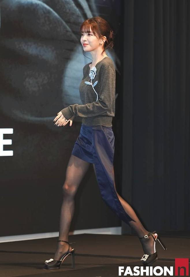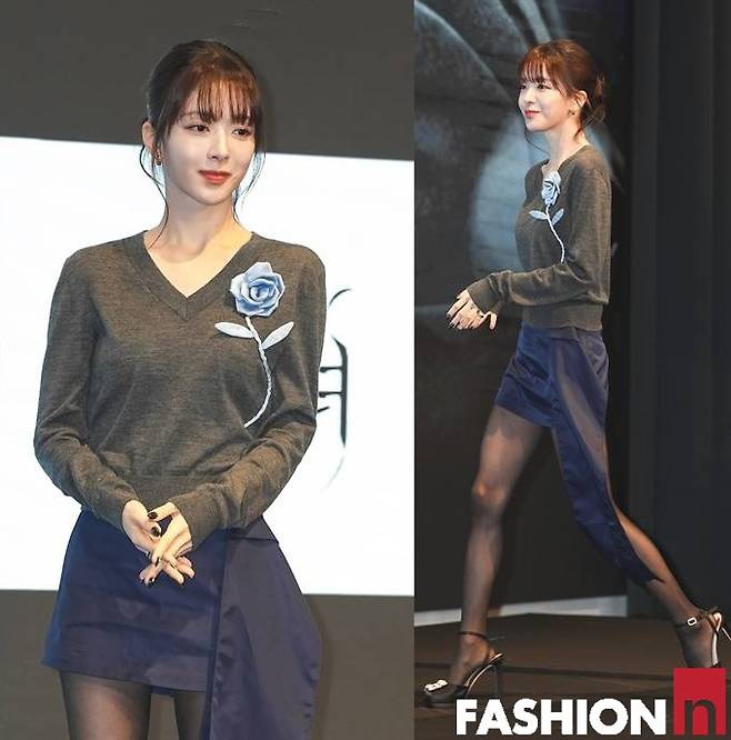 이날 노정의는 꽃장식이 눈에 띄는 V넥 니트와 꼬리처럼 긴 트레인이 달린 미니 스커트를 매치한 상큼 발랄한 봄맞이 패션으로 눈길을 끌었다.