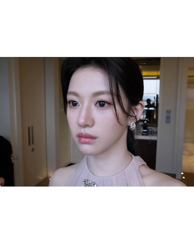 클로즈업 컷에서는 맑고 투명한 피부 톤과 정제된 아이 메이크업이 시선을 끌어요.