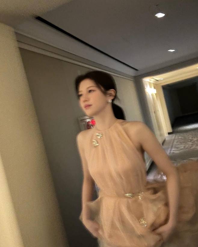 살구빛 쉬폰 드레스로 완성한 레드카펫 무드