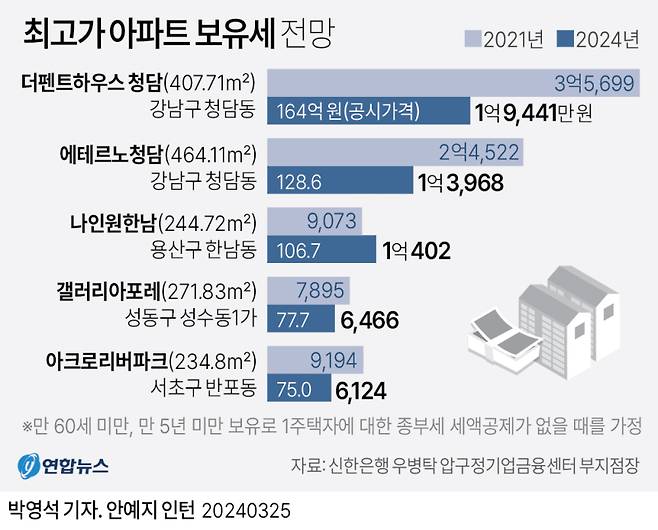 배우 장동건·고소영 부부 등 국내 최고가 아파트의 소유주들이 올해 부동산 보유세로 약 2억원을 낼 것으로 보인다.